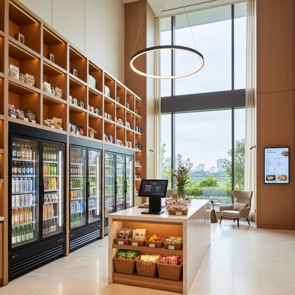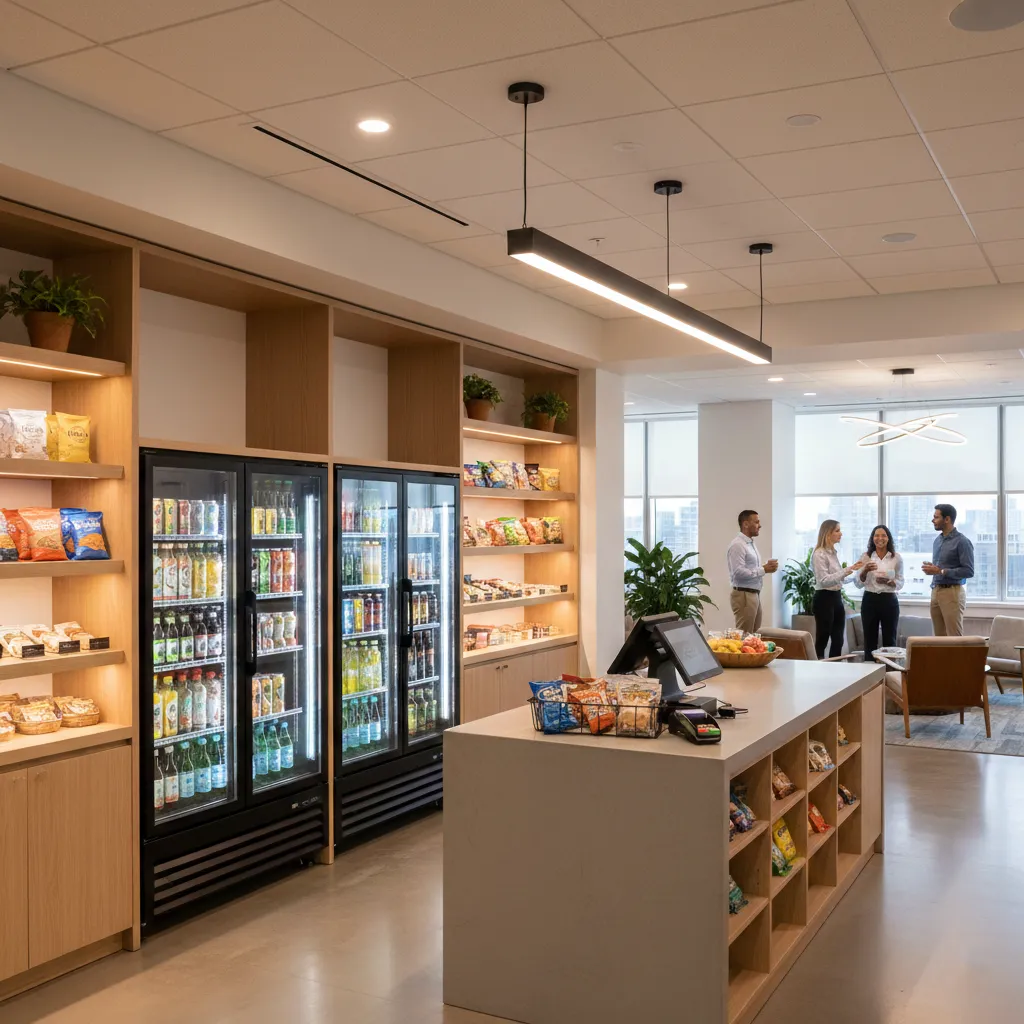 Think of a Micro Market as a miniature convenience store located directly inside your workplace. Instead of frustrating vending machines with stuck coils and limited options, your employees get open shelves, glass-front coolers, and a self-checkout kiosk.